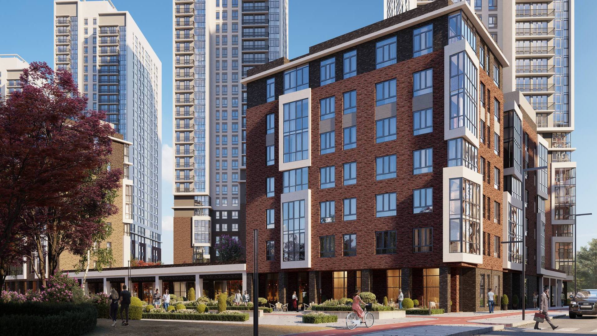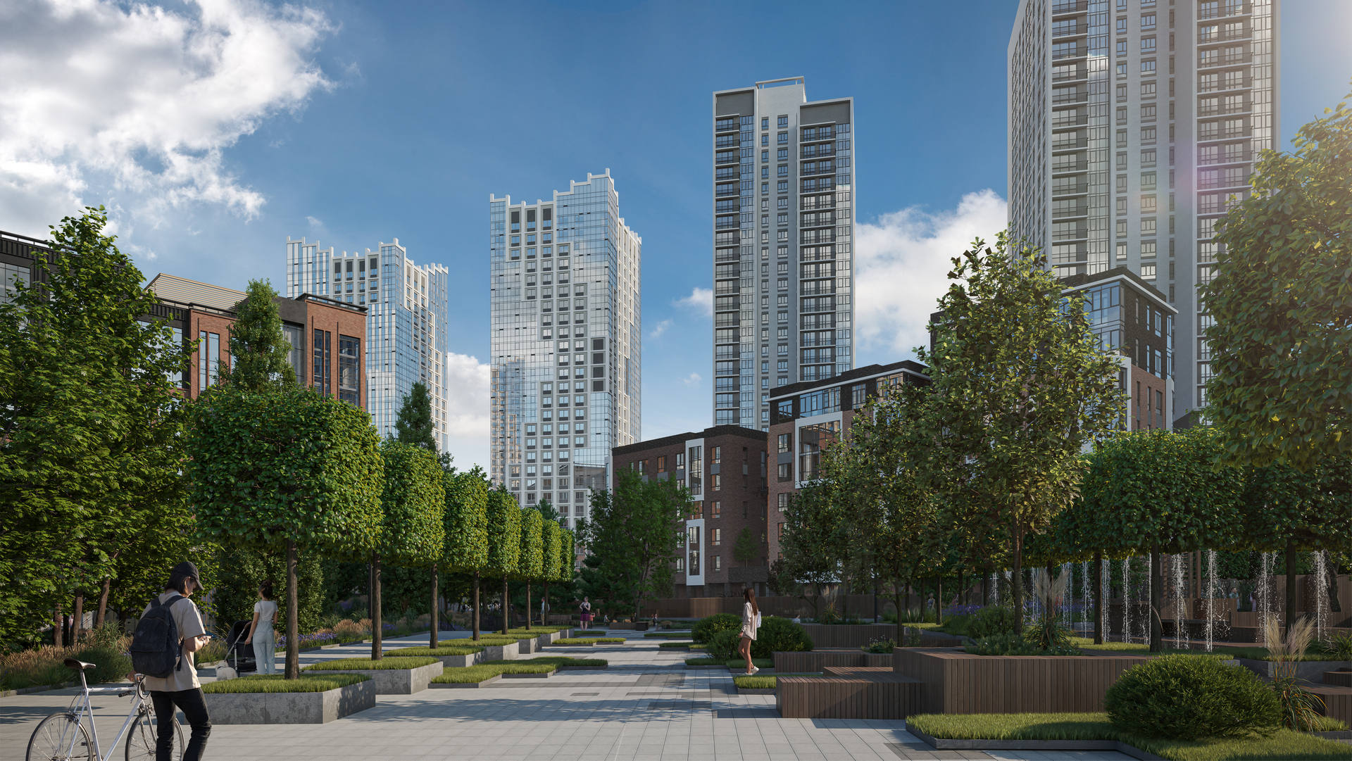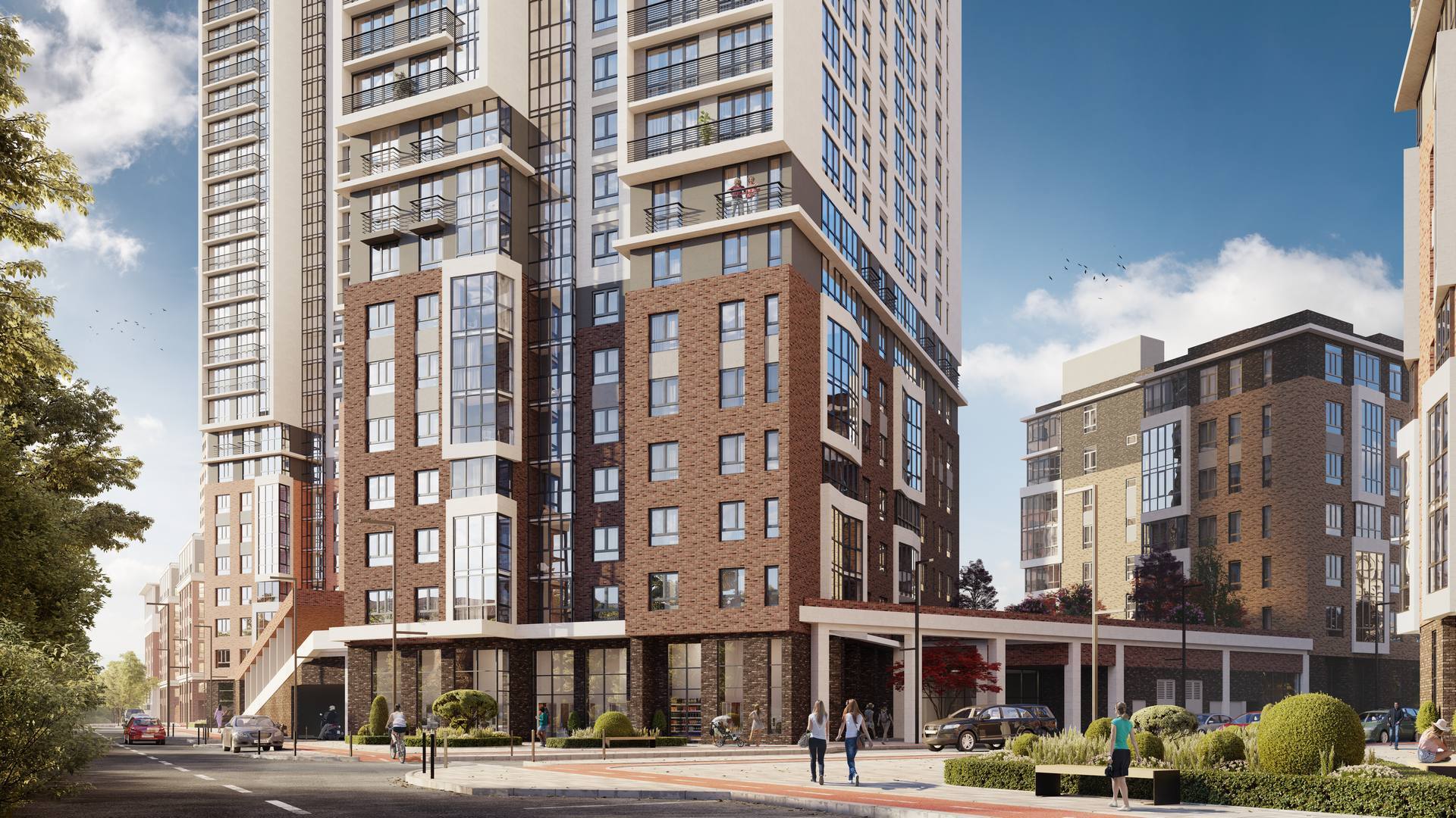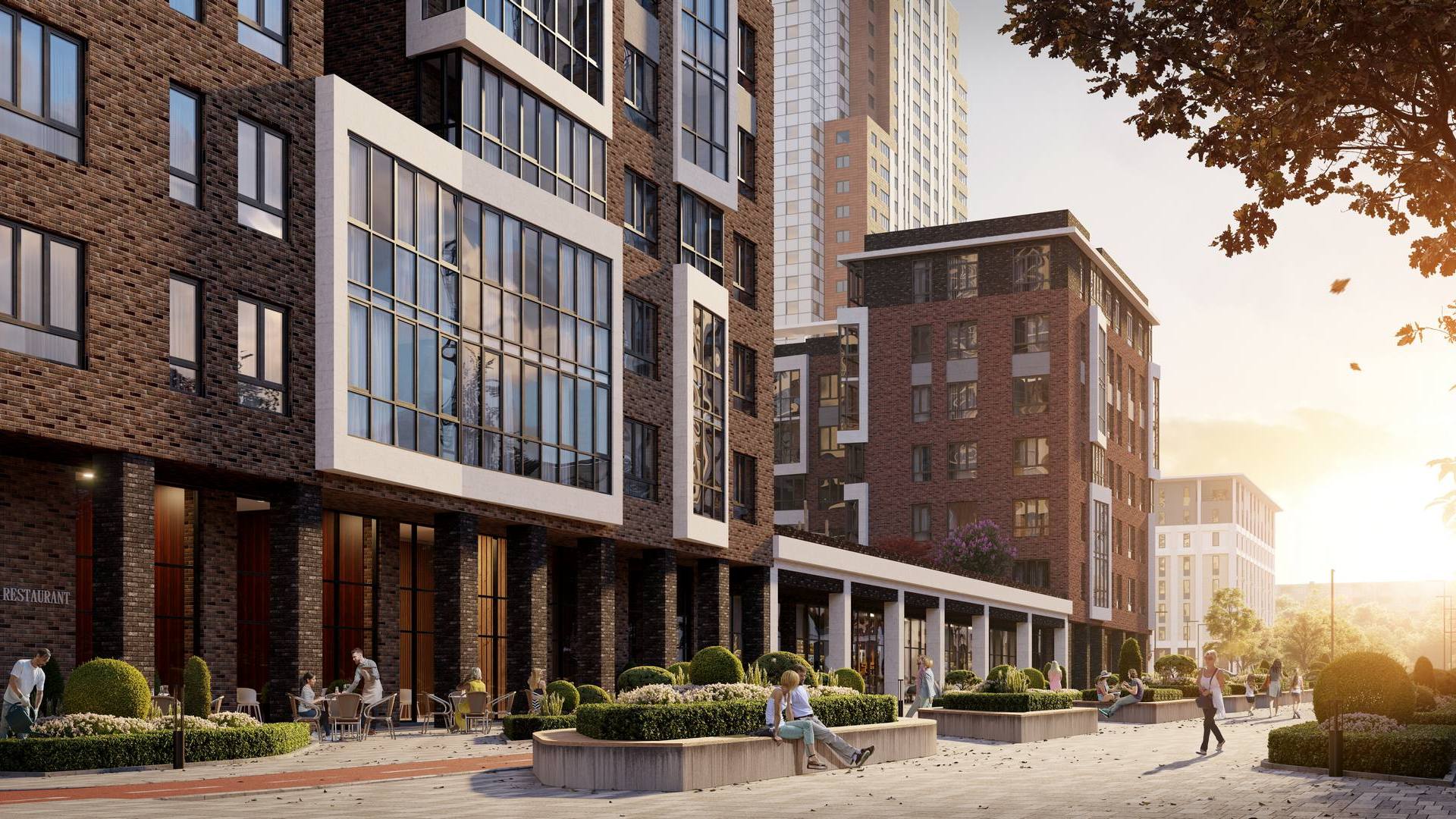 Выразительные фасады в духе новой классики. Первая очередь — ремейк сталинского ампира прямиком с исторических улиц города. Вторая очередь — современность с чистой геометрией и выразительными формами. Третья очередь — динамичное сочетание уютных урбан-вилл и современной высотной архитектуры. Четвертая очередь — амбициозные высотки и элитный клубный дом.