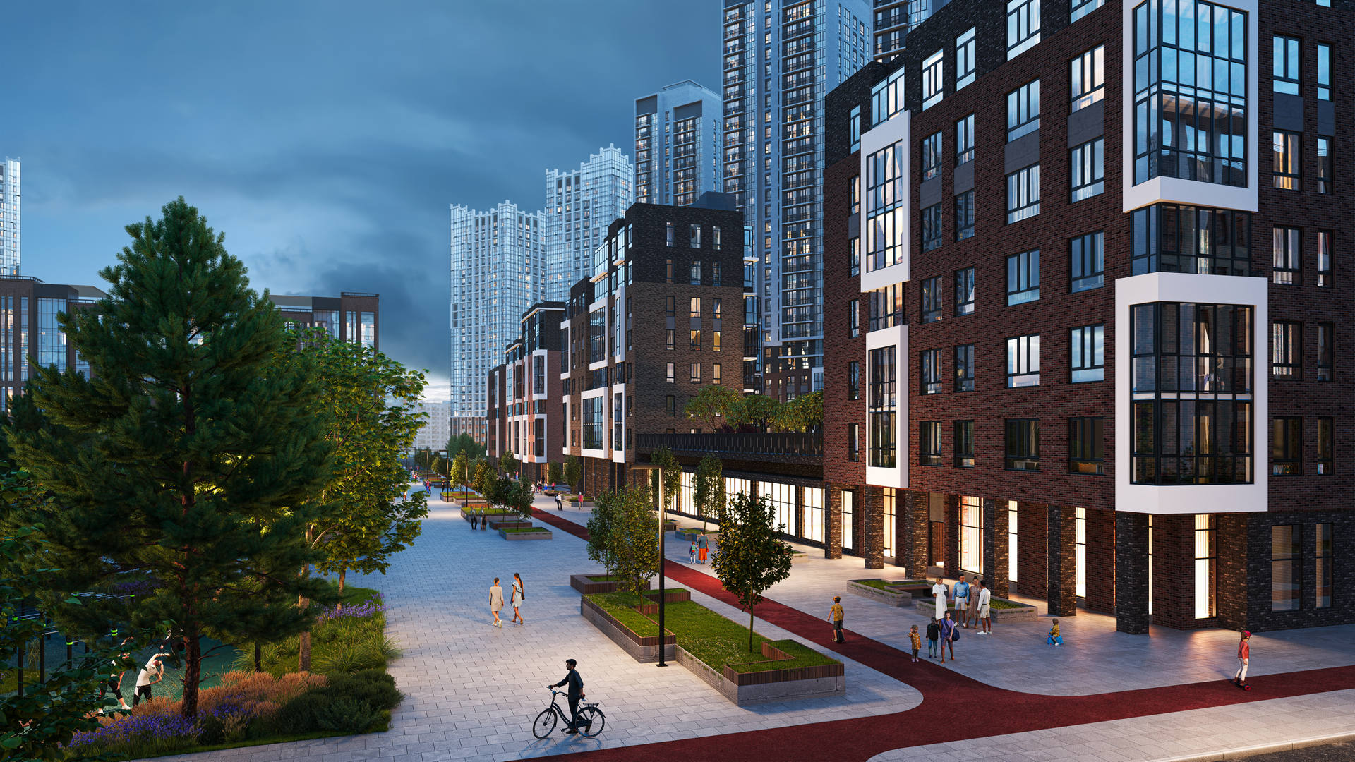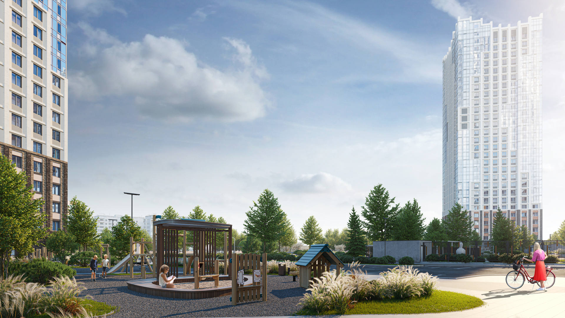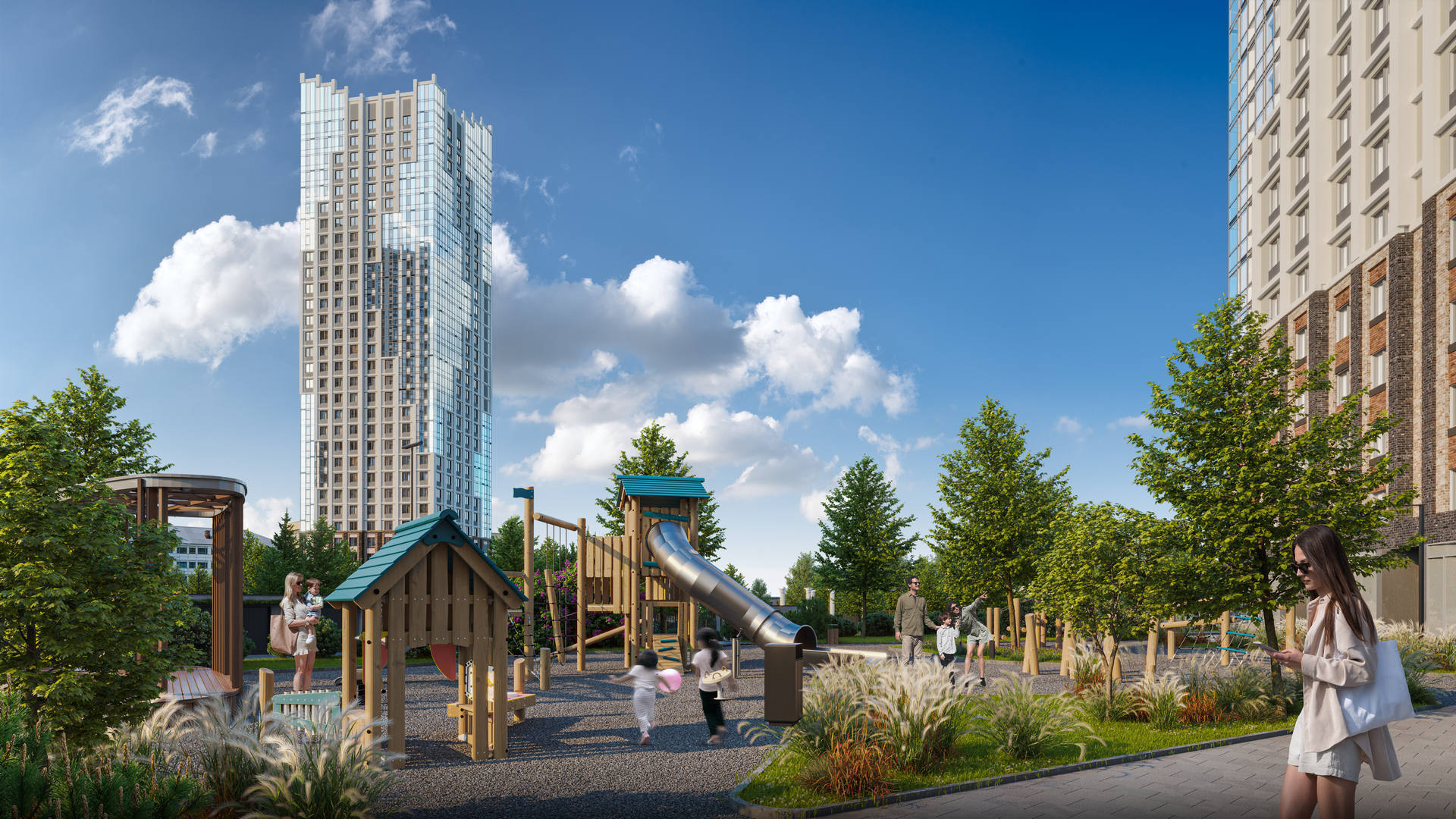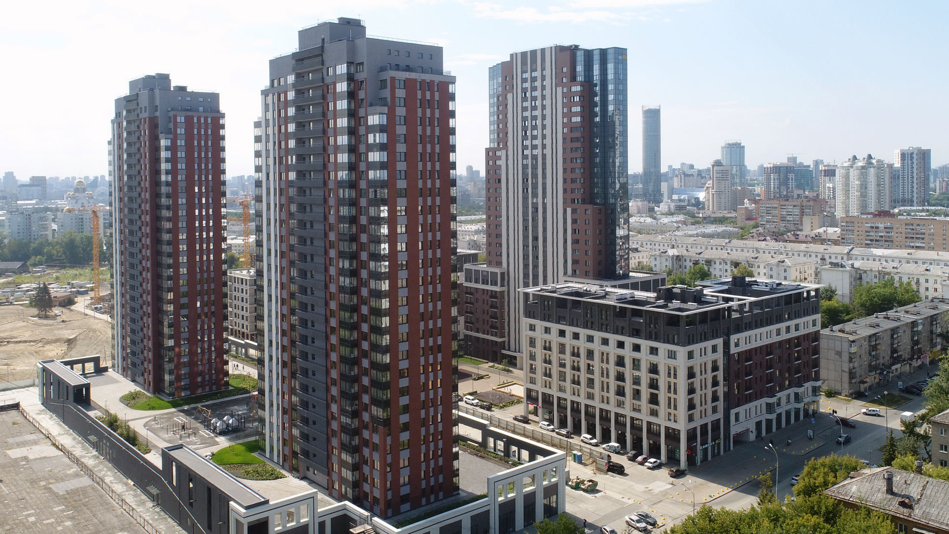 Выразительные фасады в духе новой классики. Первая очередь — ремейк сталинского ампира прямиком с исторических улиц города. Вторая очередь — современность с чистой геометрией и выразительными формами. Третья очередь — динамичное сочетание уютных урбан-вилл и современной высотной архитектуры. Четвертая очередь — амбициозные высотки и элитный клубный дом.